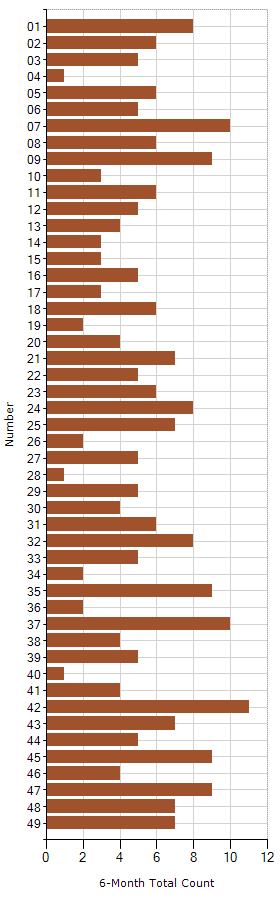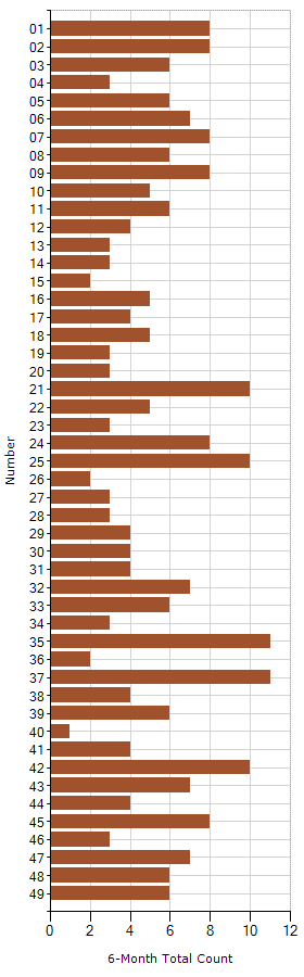 The following chart and tables present the Daily Grand statistics up-to-date. The key information includes winning number count in the past 6 months,