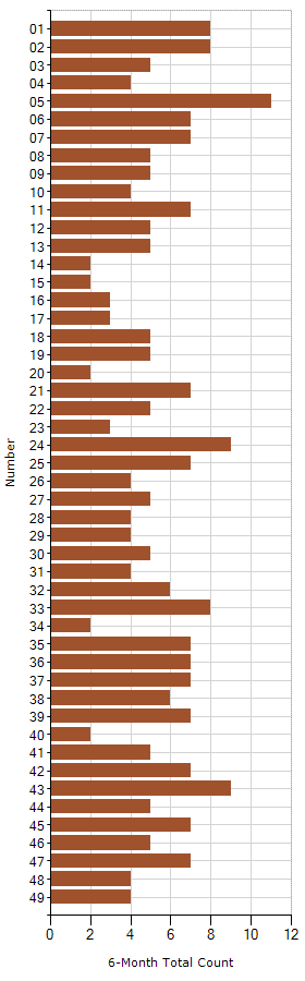 The following chart and tables present the Daily Grand statistics up-to-date. The key information includes winning number count in the past 6 months,