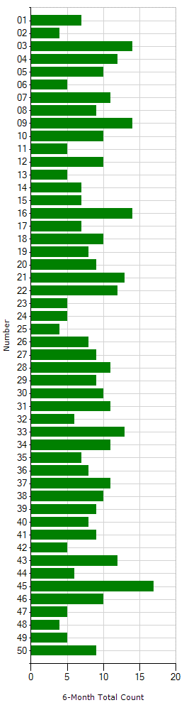 The chart data is derived from the total count of winning numbers in the past 6 months. Since the bonus number is selected