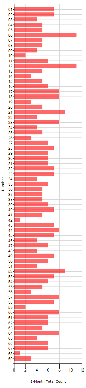 The following Powerball chart and count table are derived from the winning numbers of the last 6 months. The chart is ordered by