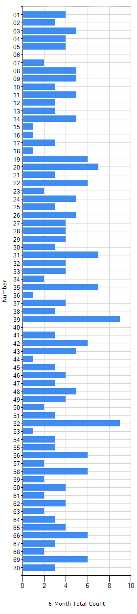 This is the latest Mega Millions number statistics and number chart, presented with 6-month data. In the table, the numbers are sorted by their corresponding
